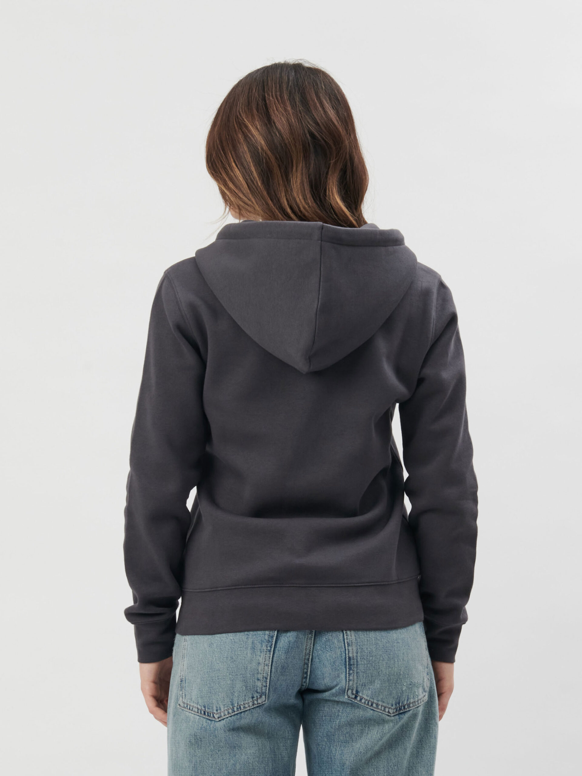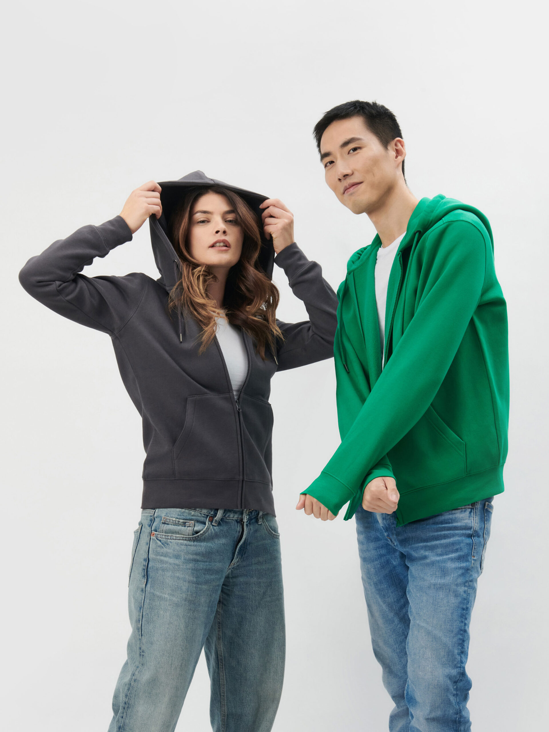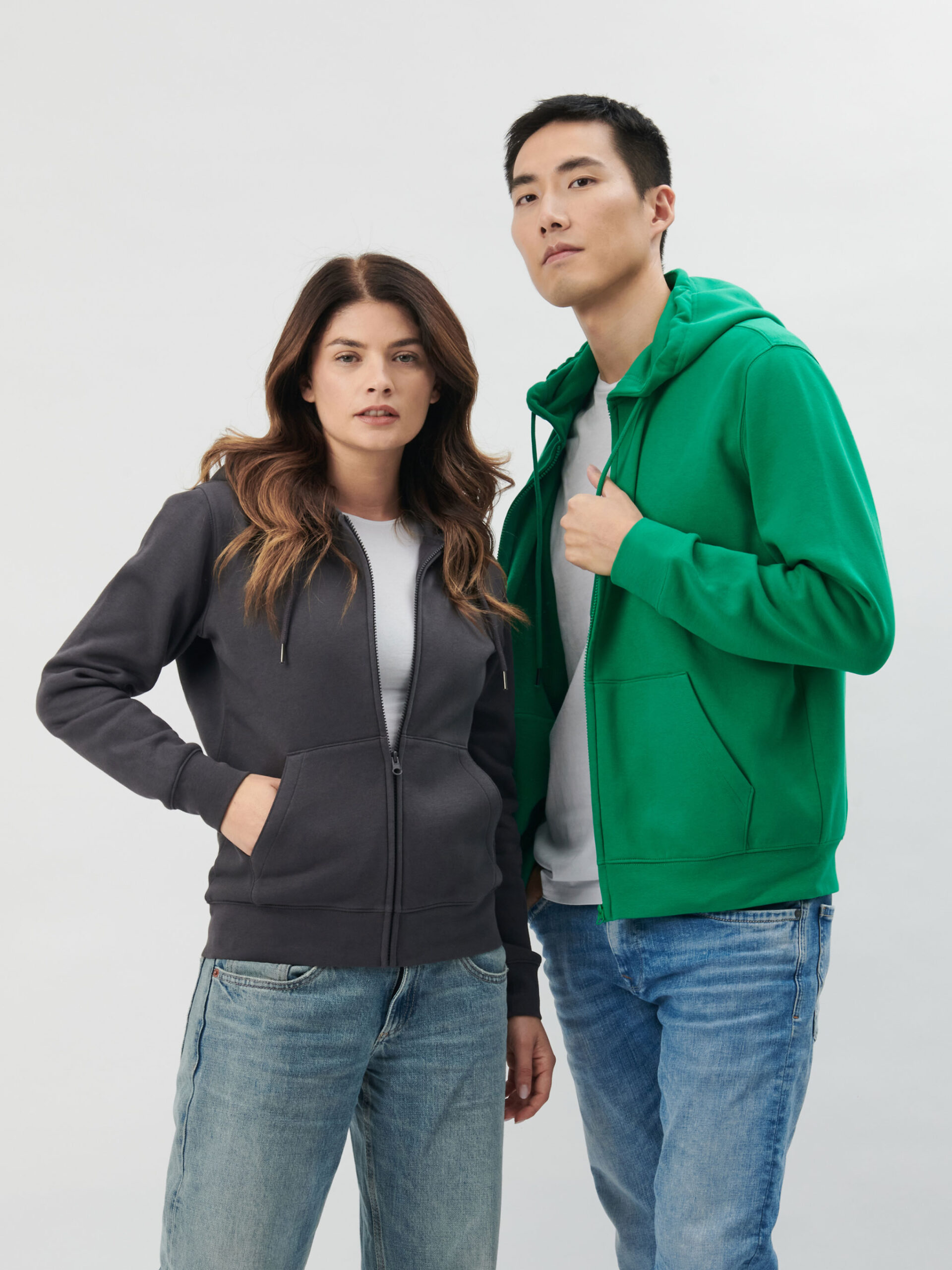 Felpa con cappuccio a doppio strato, maniche set-in, cerniera tono su tono coperta, occhielli e cordini con punta in metallo, tasca a marsupio, orlo inferiore e polsini in costina, struttura con cuciture laterali. Etichetta strappabile. Felpata internamente. Lavorazione a 3 fili: esterno 100% cotone per un’ottima qualità di stampa, stabilità dimensionale e resistenza ai lavaggi.